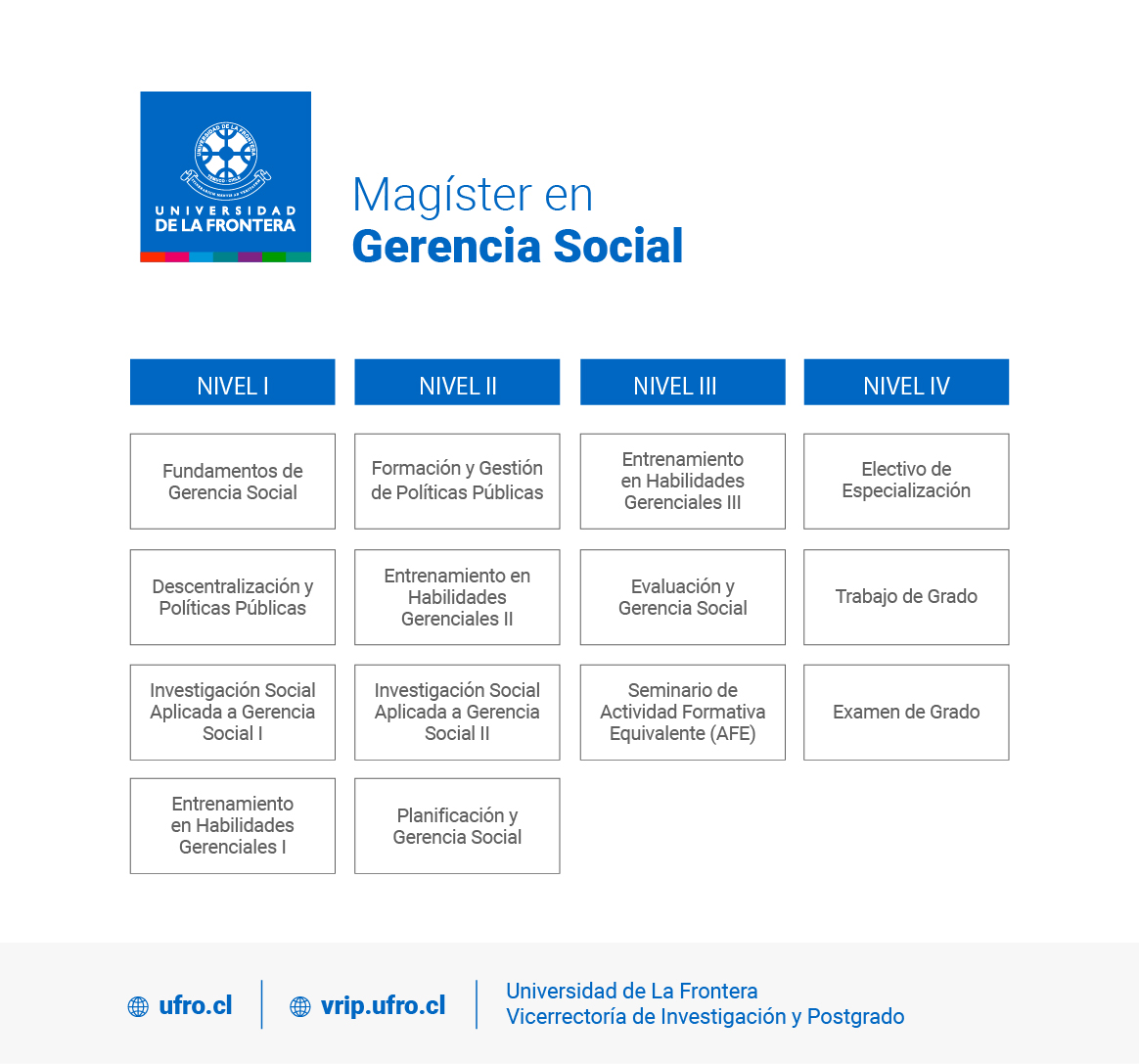 El/la Magíster en Gerencia Social formado/a en la Universidad de La Frontera es un/a postgraduado/a que puede desempeñarse en instituciones, tanto públicas como privadas, con formación en los ámbitos de (1) desarrollo, ejecución y evaluación de políticas públicas; (2) gestión gerencial a nivel público y privado de programas sociales; e (3) investigación social aplicada a gerencia social.